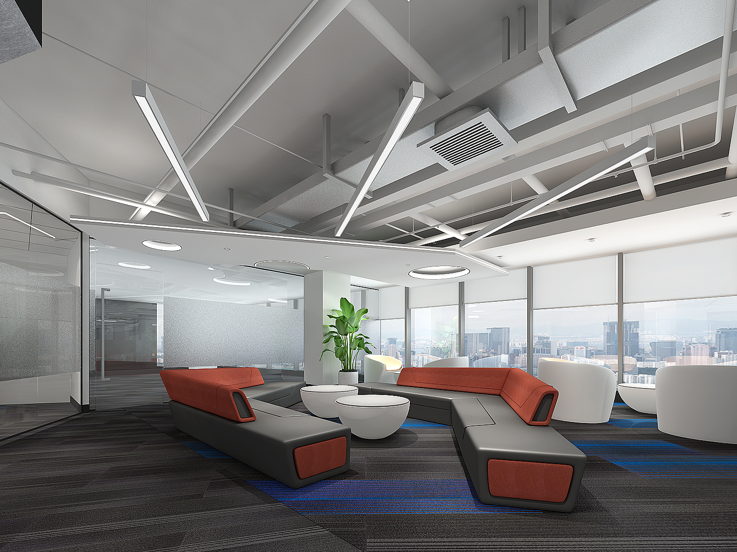 整體空間被劃分成兩個不同的功能區(qū)域,開放式辦公區(qū)以組團的形式分布于光線最好的位置,休閑區(qū)、洽談區(qū)、等則充滿創(chuàng)意的散布在工位區(qū)附近。將多個節(jié)點、路徑應(yīng)用到空間中,合理分配各節(jié)點服務(wù)的功能區(qū),形成非線性的空間序列,賦予了空間靈活性。